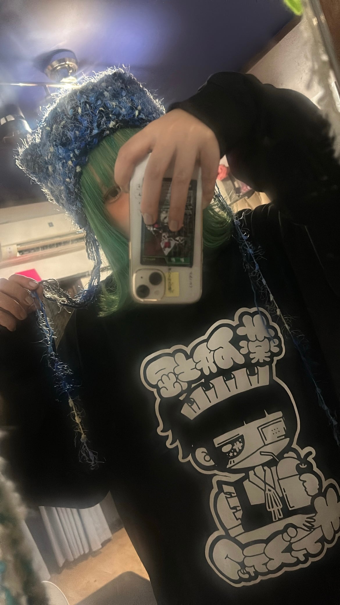 黒と青ときらきらした糸で手編みしています。